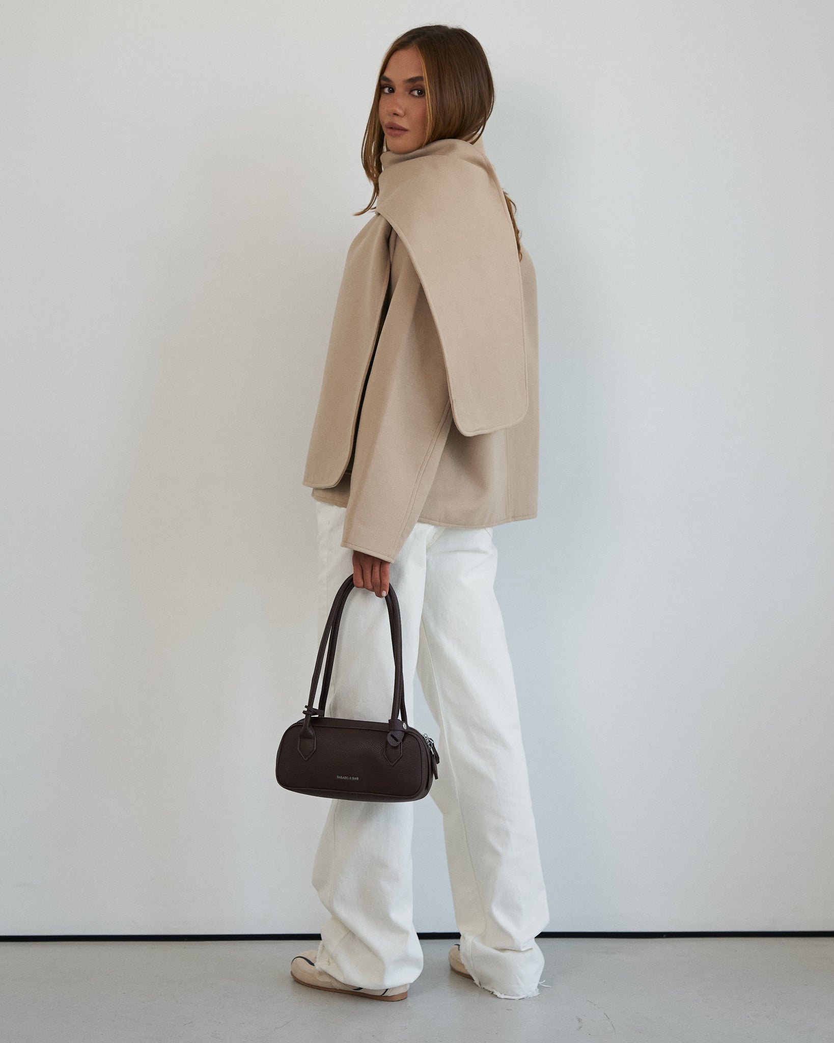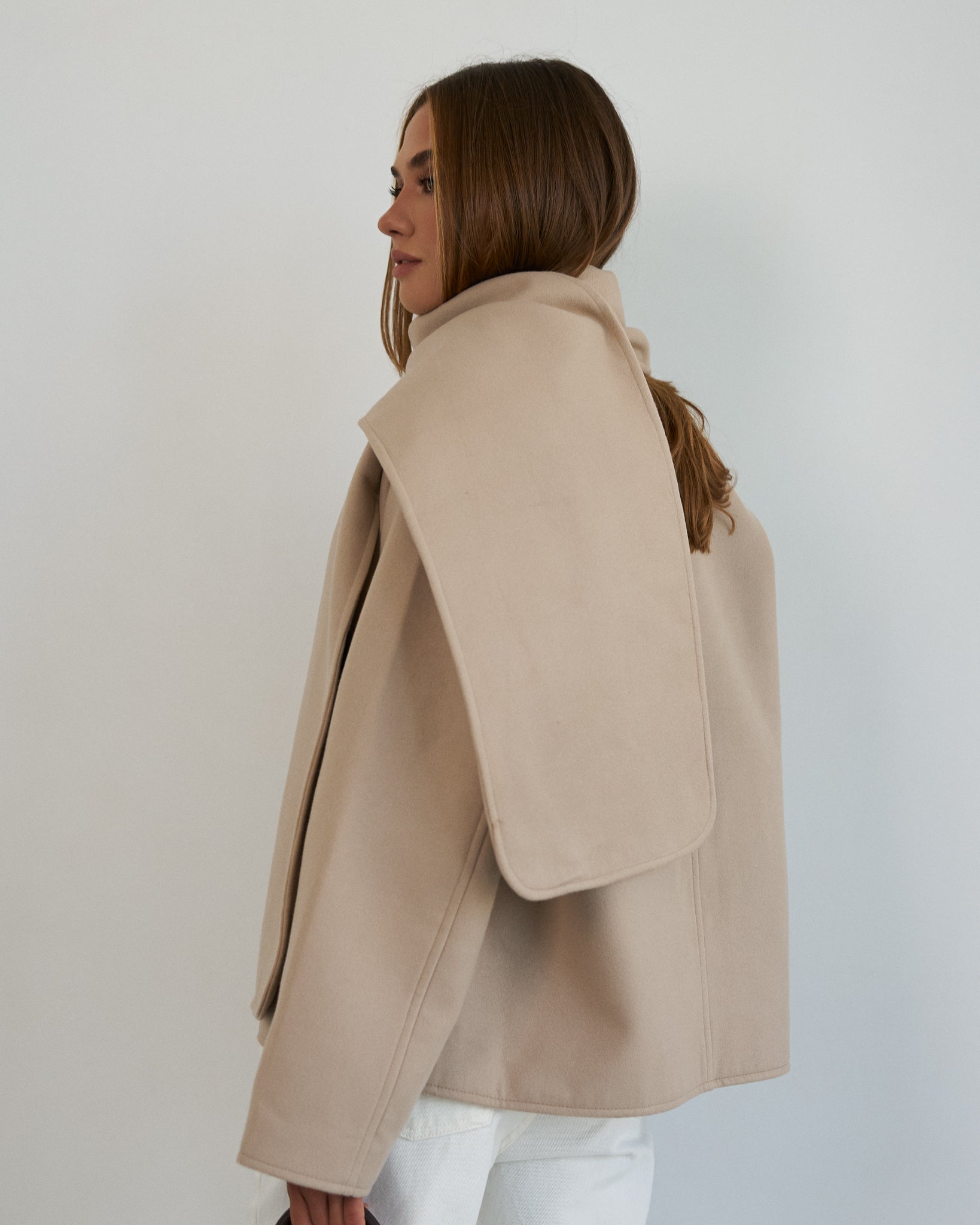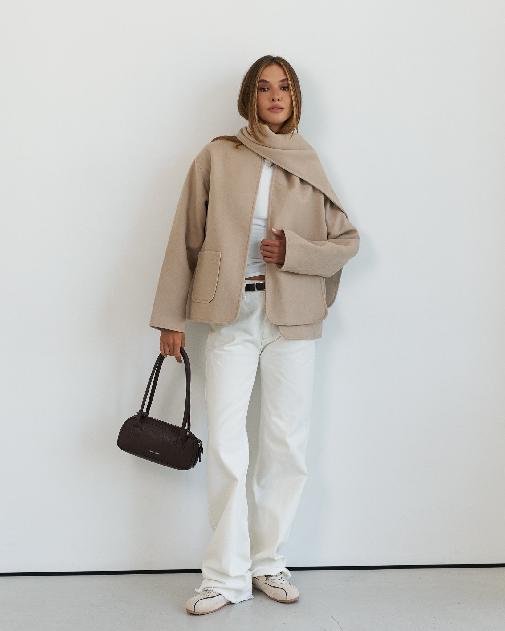 - Kompletny look — kurtka i szalik tworzą harmonijną i dopracowaną stylizację.