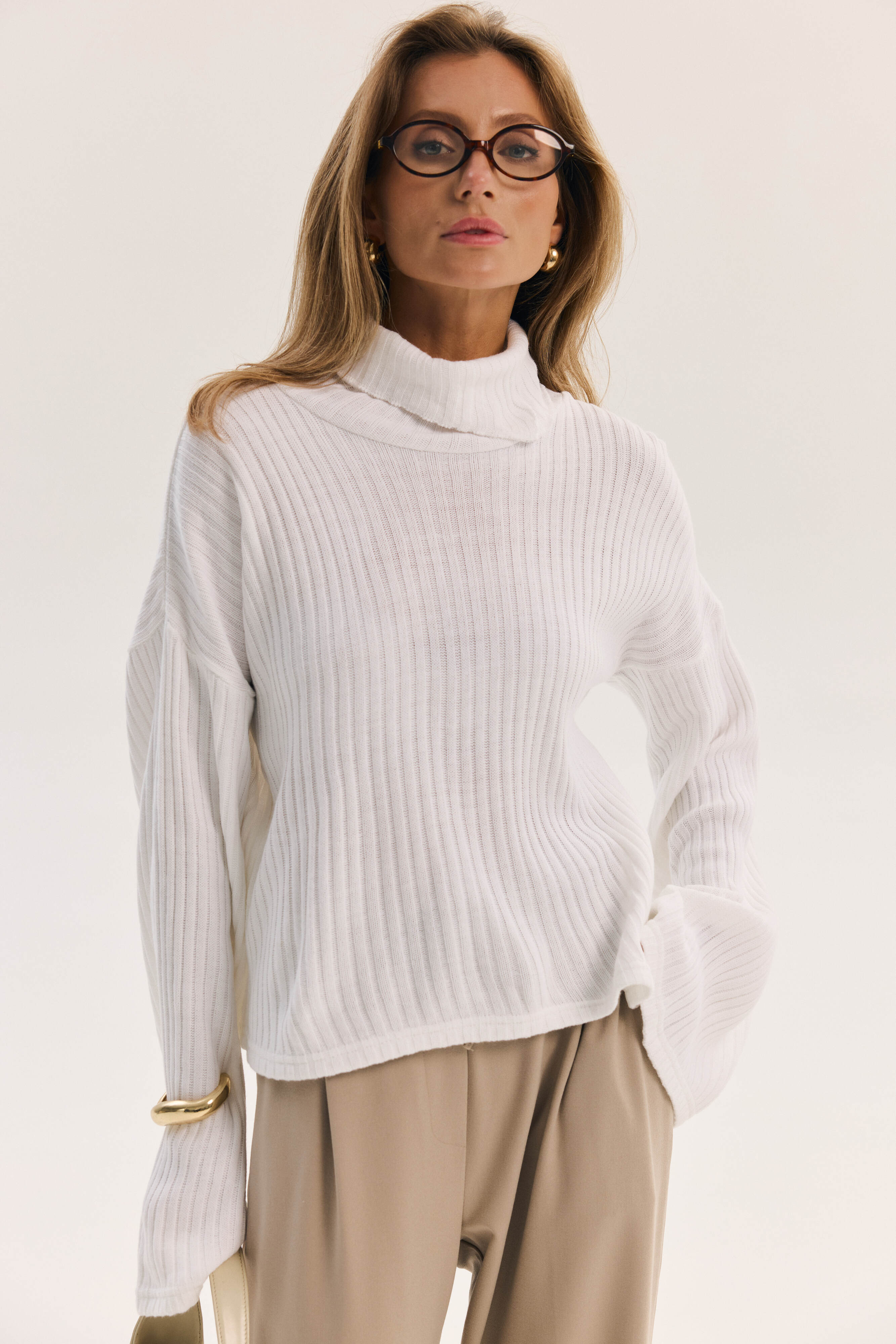 Luźny sweter z magnesem – stylowy i modny element garderoby. Krótki krój i oversize'owy fason tworzą modne stylizacje, a uniwersalny fason łatwo komponuje się z jeansami, spódnicami i spodniami, dodając harmonii i eleganckiego wykończenia stylizacji.