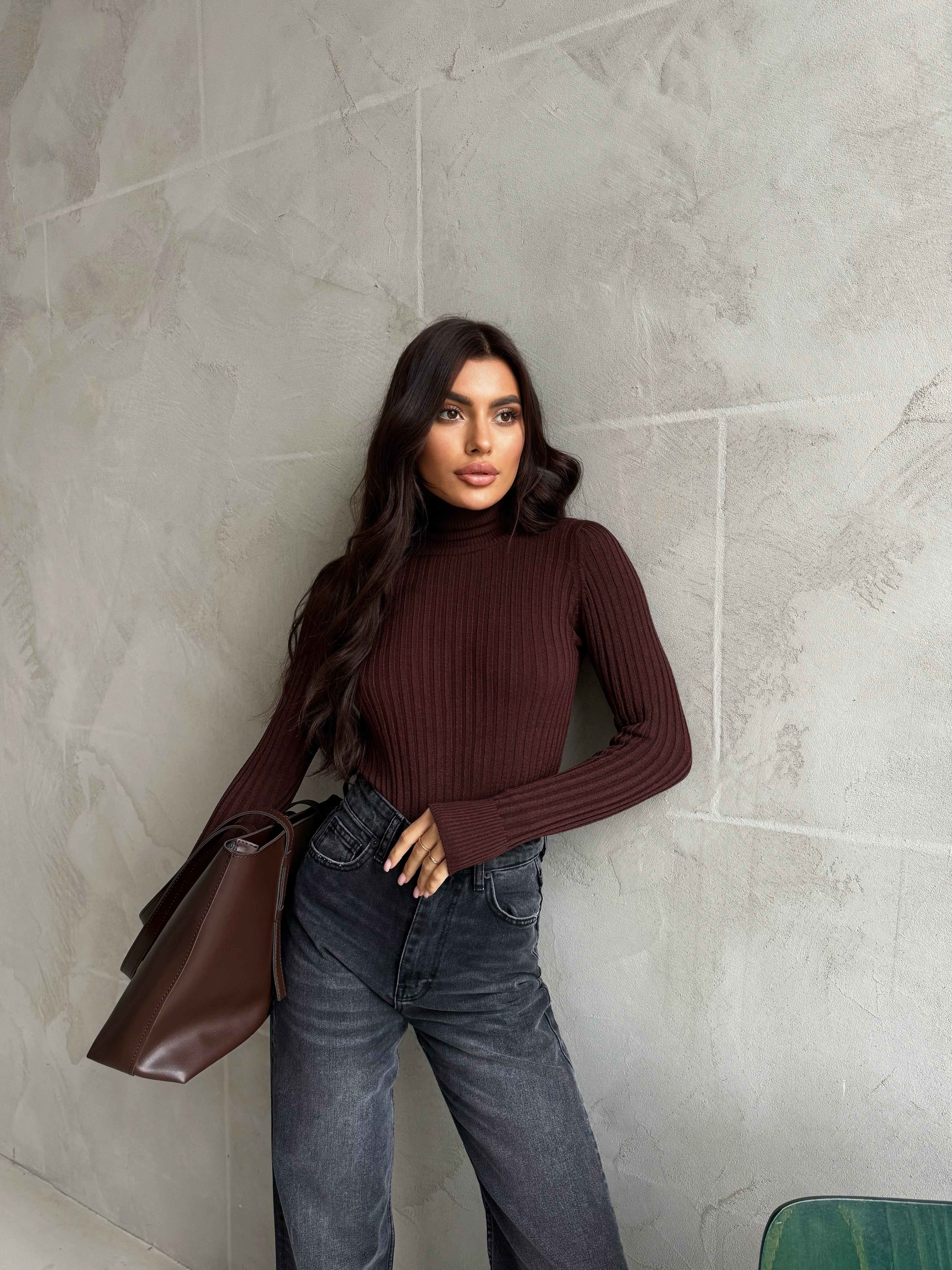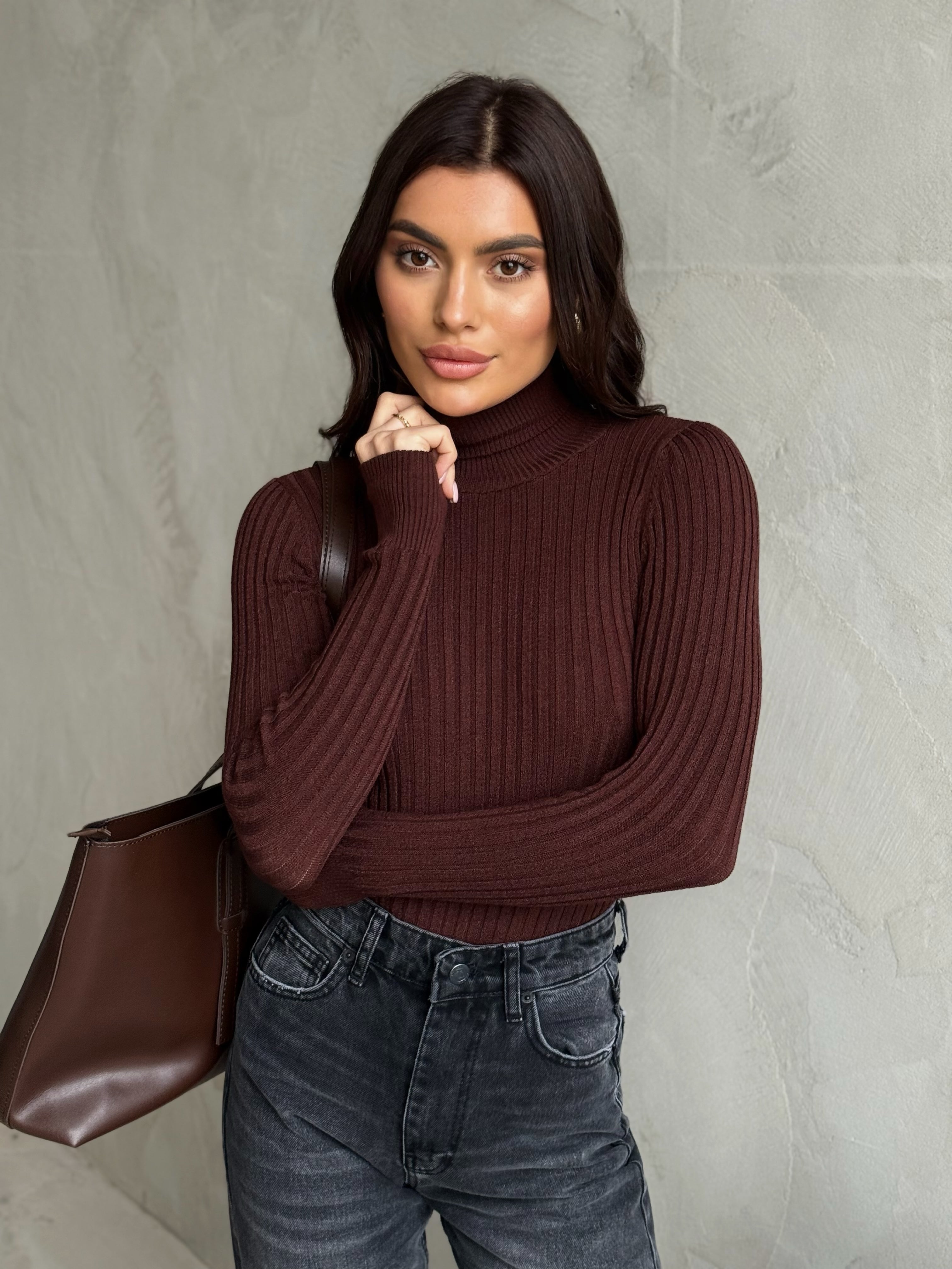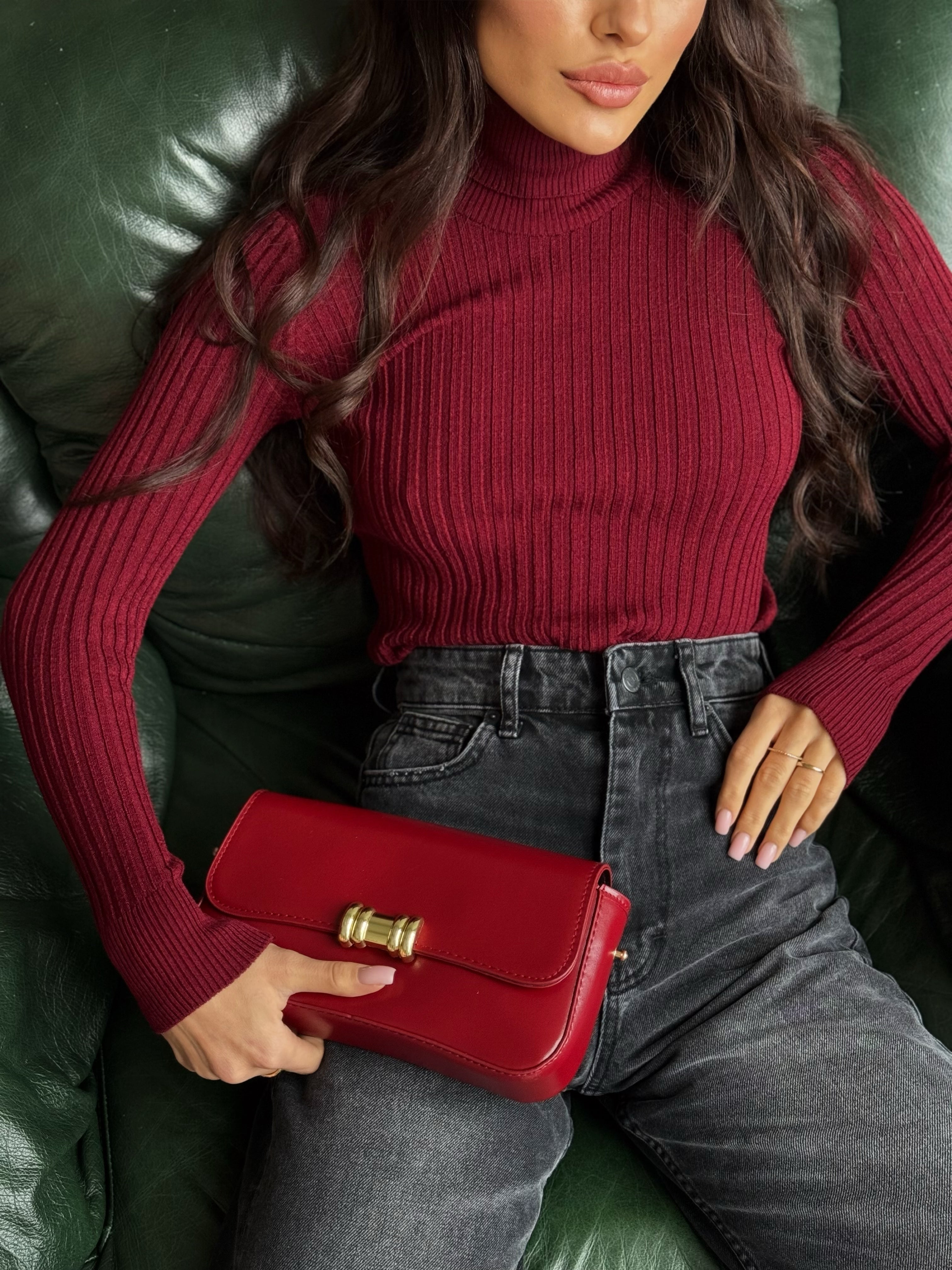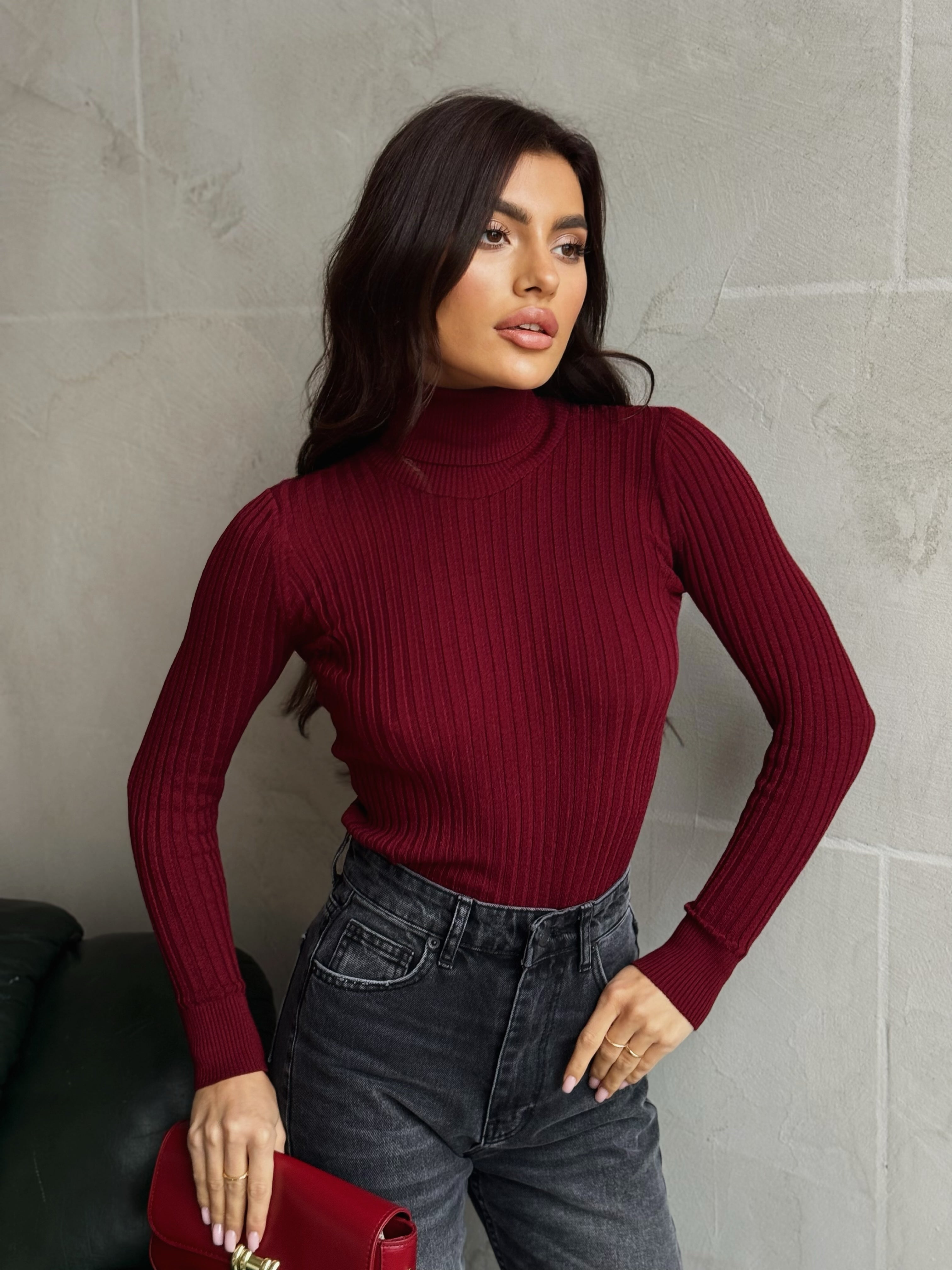 Prążkowany golf – stylowy i uniwersalny element garderoby. Elastyczny materiał zapewnia całodzienny komfort, a minimalistyczny krój sprawia, że można go łatwo zestawiać z jeansami, spódnicami i spodniami, tworząc zarówno casualowe, jak i formalne stylizacje.