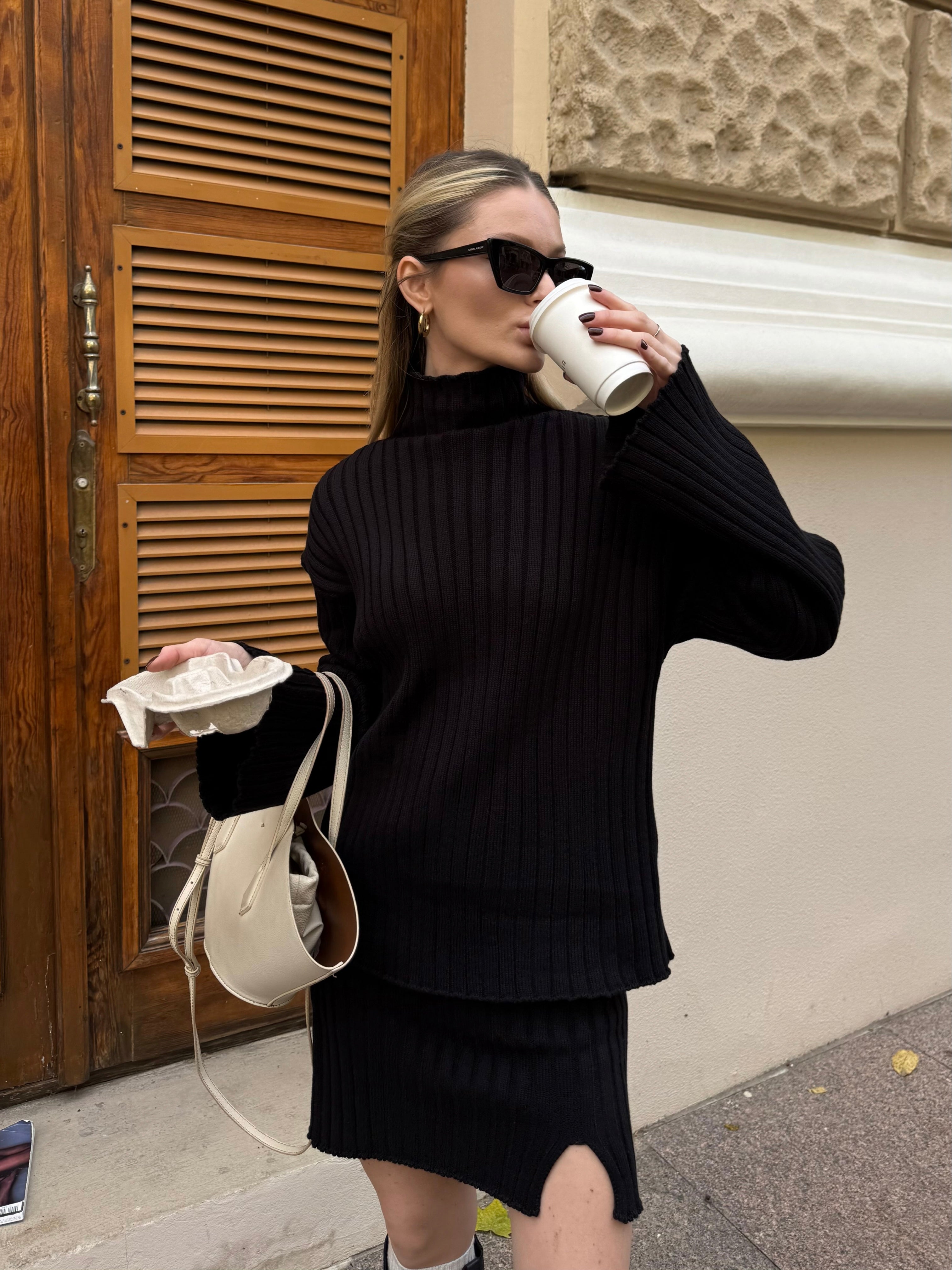 - Połączenie swetra i spódnicy tworzy stylowy i kobiecy look