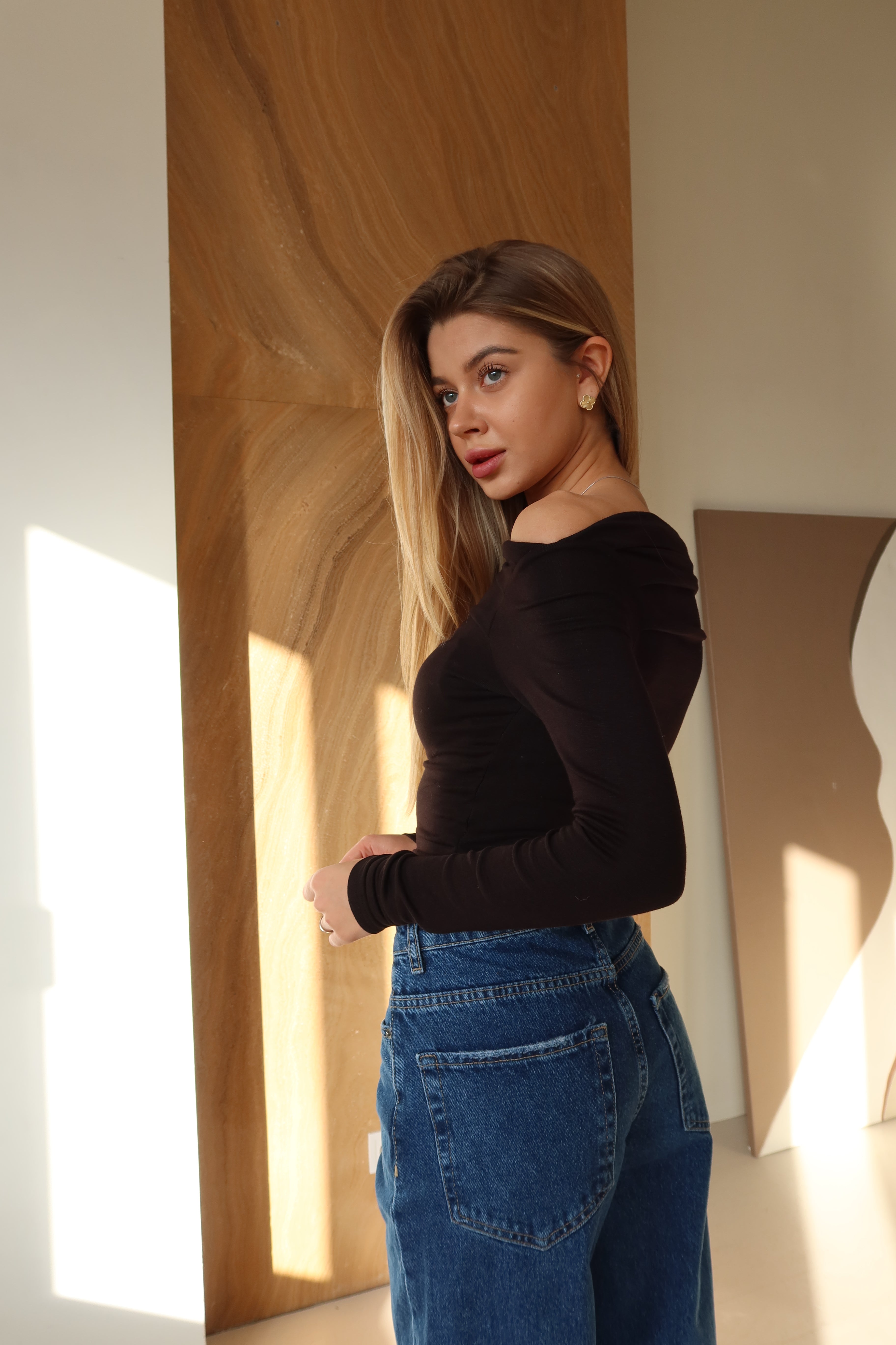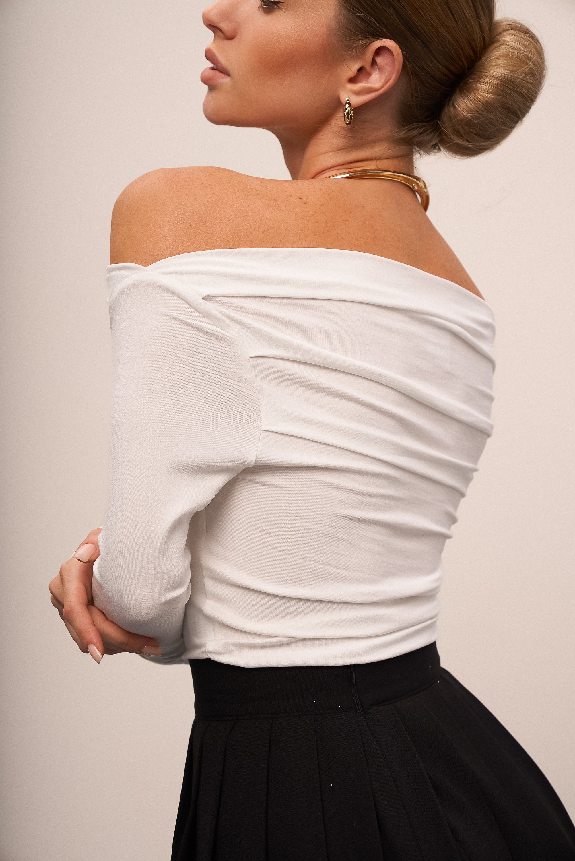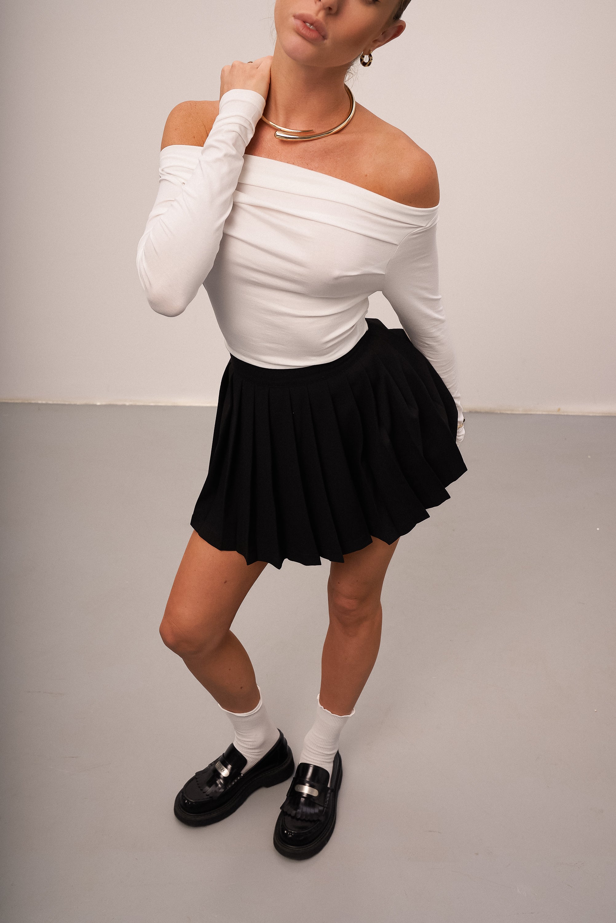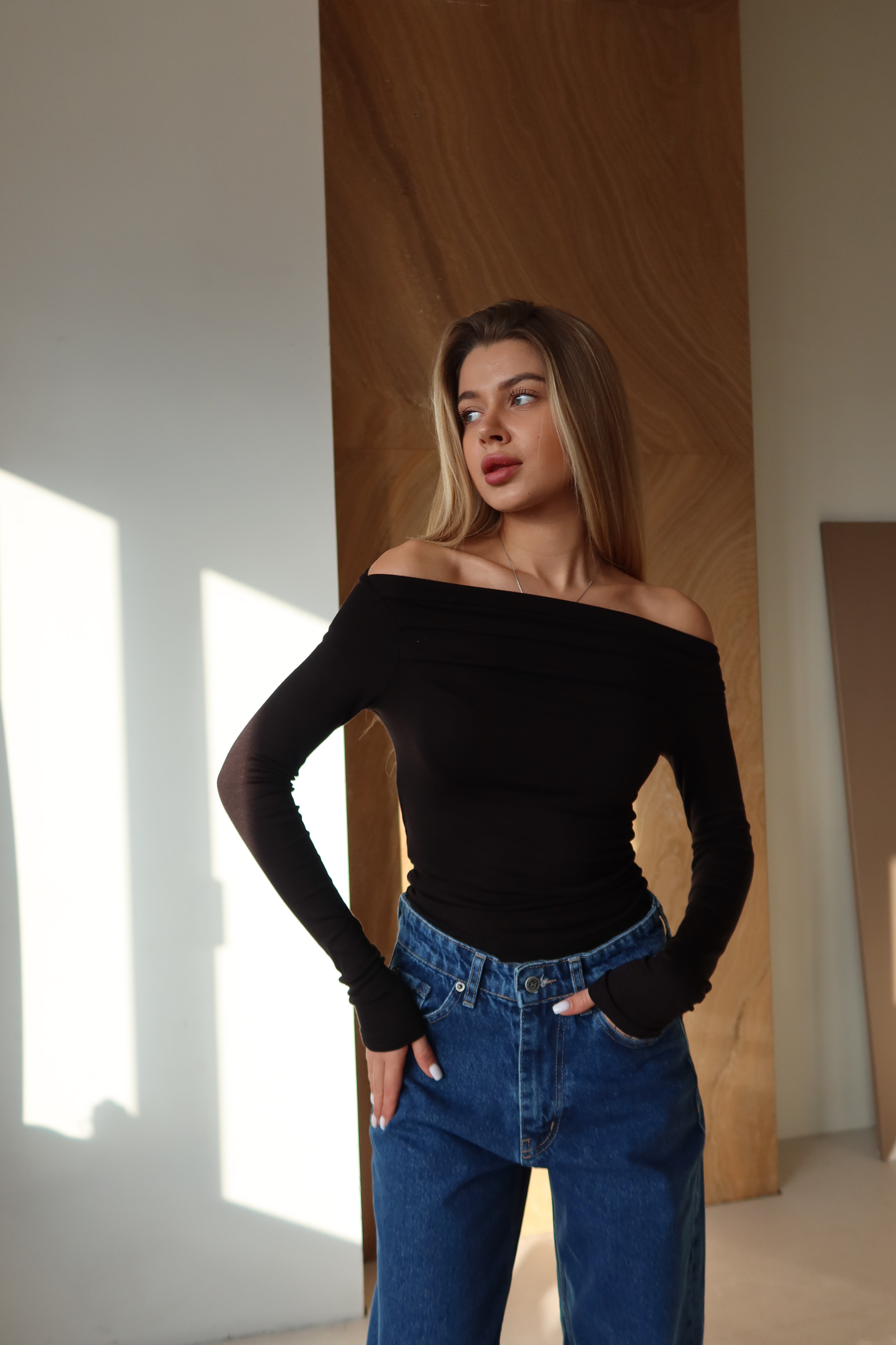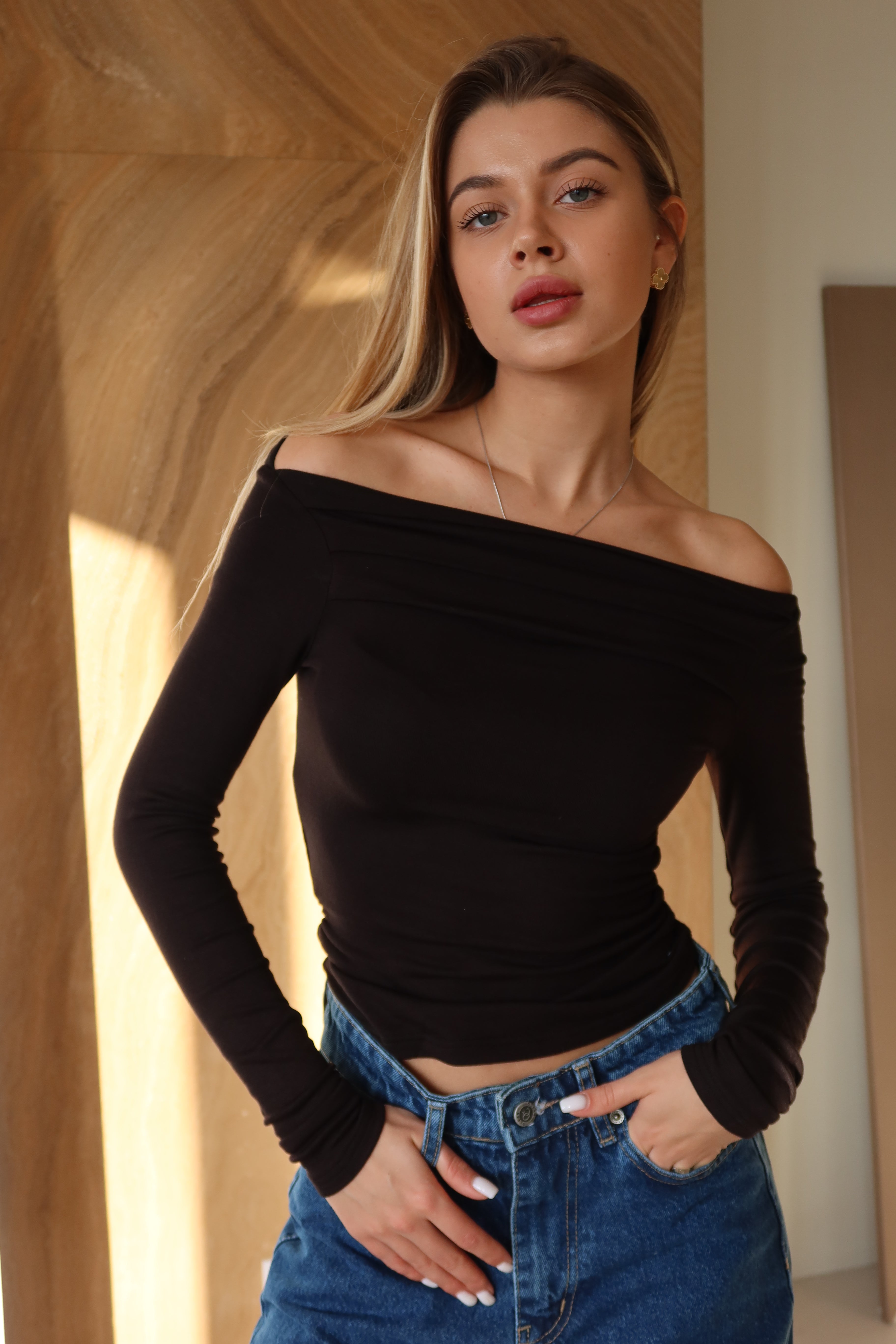 Modna sukienka z długim rękawem i obniżonymi ramionami — uniwersalny element garderoby, który z łatwością uzupełni każdą stylizację.